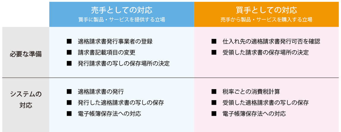 多くの企業は「売り手」「買い手」、双方の面を持っています。以下の図にインボイス制度が始まるまでに、確認、準備しておきたい項目を並べました。
