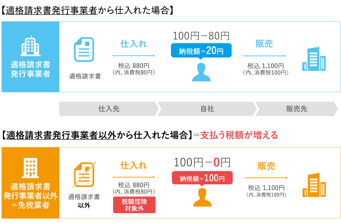 インボイス制度が開始されると、適格請求書発⾏事業者以外から仕⼊れを⾏った場合に、原則として仕⼊税額控除が適⽤されなくなり、納税額が増えます。