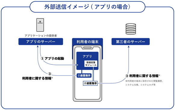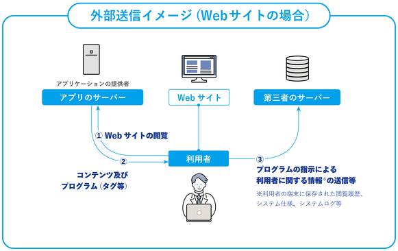 ウェブサイト運営者やアプリケーション提供者などのサービス事業者は、利用者の端末に外部に送信を指示するプログラムを送る場合は、あらかじめ、送信される利用者に関する情報の内容などを、通知・公表(利用者が知ろうとすれば、時間的にも、その手段においても、簡単に知ることができる状態)をする必要があります。