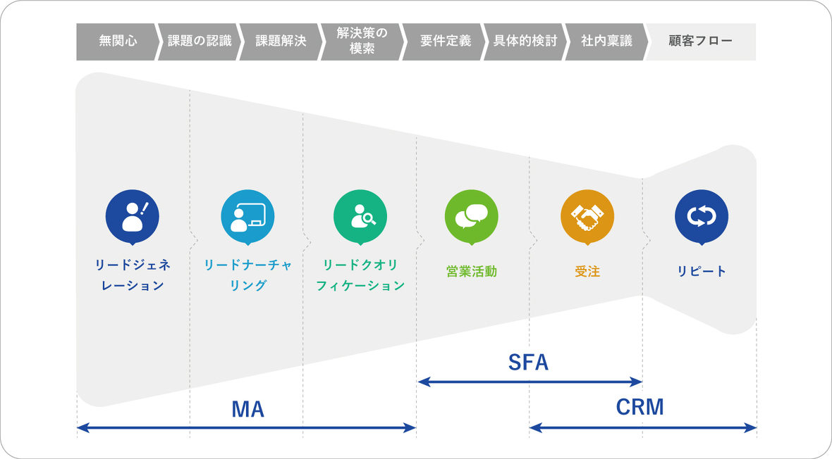 CRMやSFA、MAの説明を受けた企業様では、上記のような図を見た方も多いのではないでしょうか?その説明の中で「SFAやMAとしても利用できます」と記載や説明されていることが多いと思います。